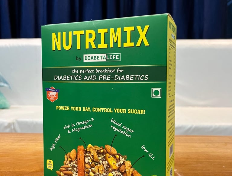 Our flagship product, NutriMix, is a lab-tested, diabetic-friendly cereal blend made with local superfoods like millets, oats, and seeds—designed for low glycemic impact, high protein, and zero hidden sugars. Unlike other "diabetic-friendly" products, we prioritize transparency, science, and real health benefits.